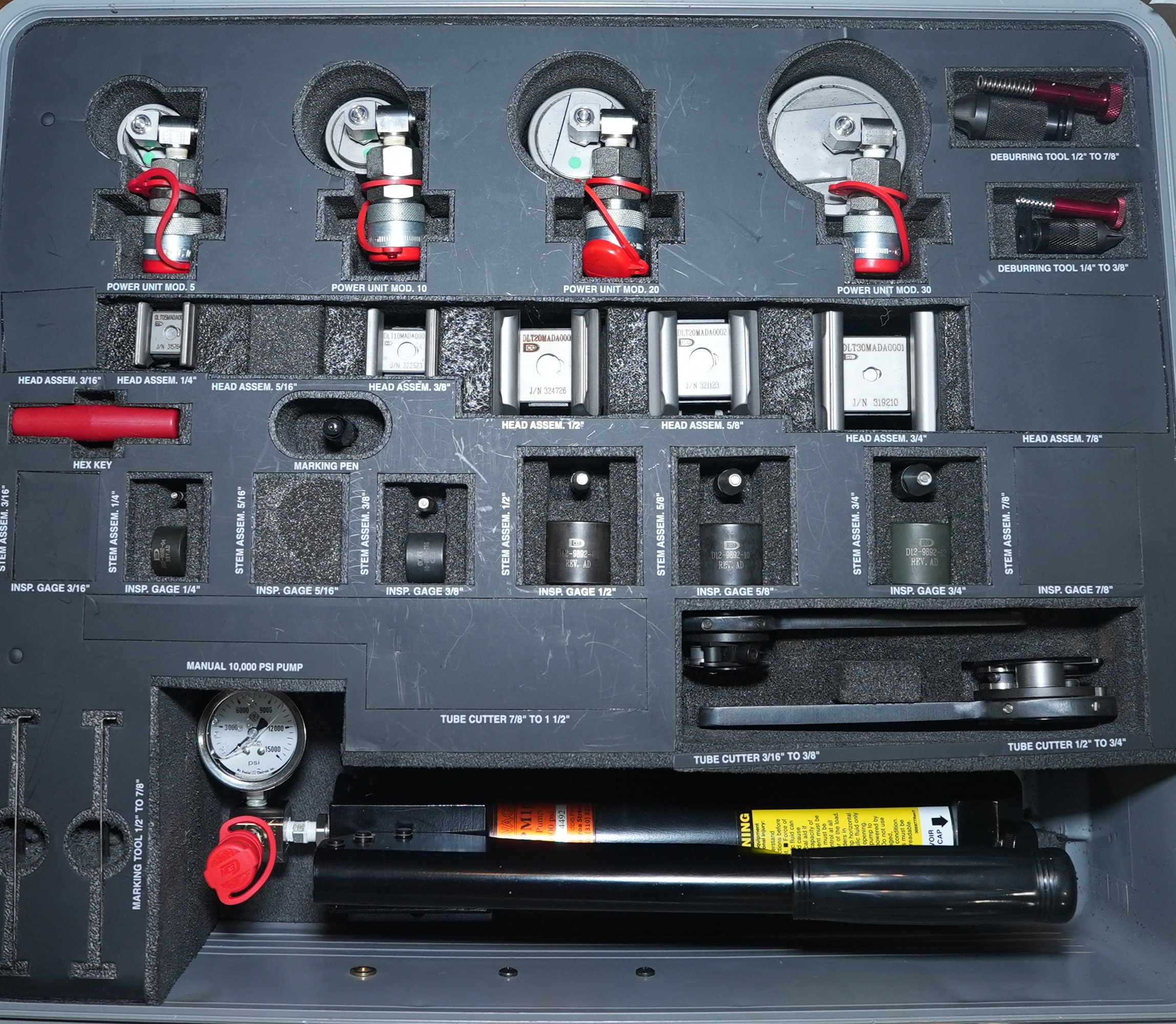 The Permaswage® DLTFRPSKT3001 Field Repair Tool Kit is designed for tubing sizes 1/4" (size -04), 3/8" (size -06), 1/2" (size -08), 5/8" (size -10), and 3/4" (size -12). The tools in this kit operate at up to 10,000 psi and are suitable for hydraulic systems with operating pressures of up to 3,000 psi, ensuring secure and reliable Permaswage connections. This comprehensive kit includes all the necessary tools and accessories for cutting, deburring, and inspection operations for the listed sizes. A manual pump is included, making it compact, portable, and ideal for efficient field maintenance and repair tasks in demanding environments.