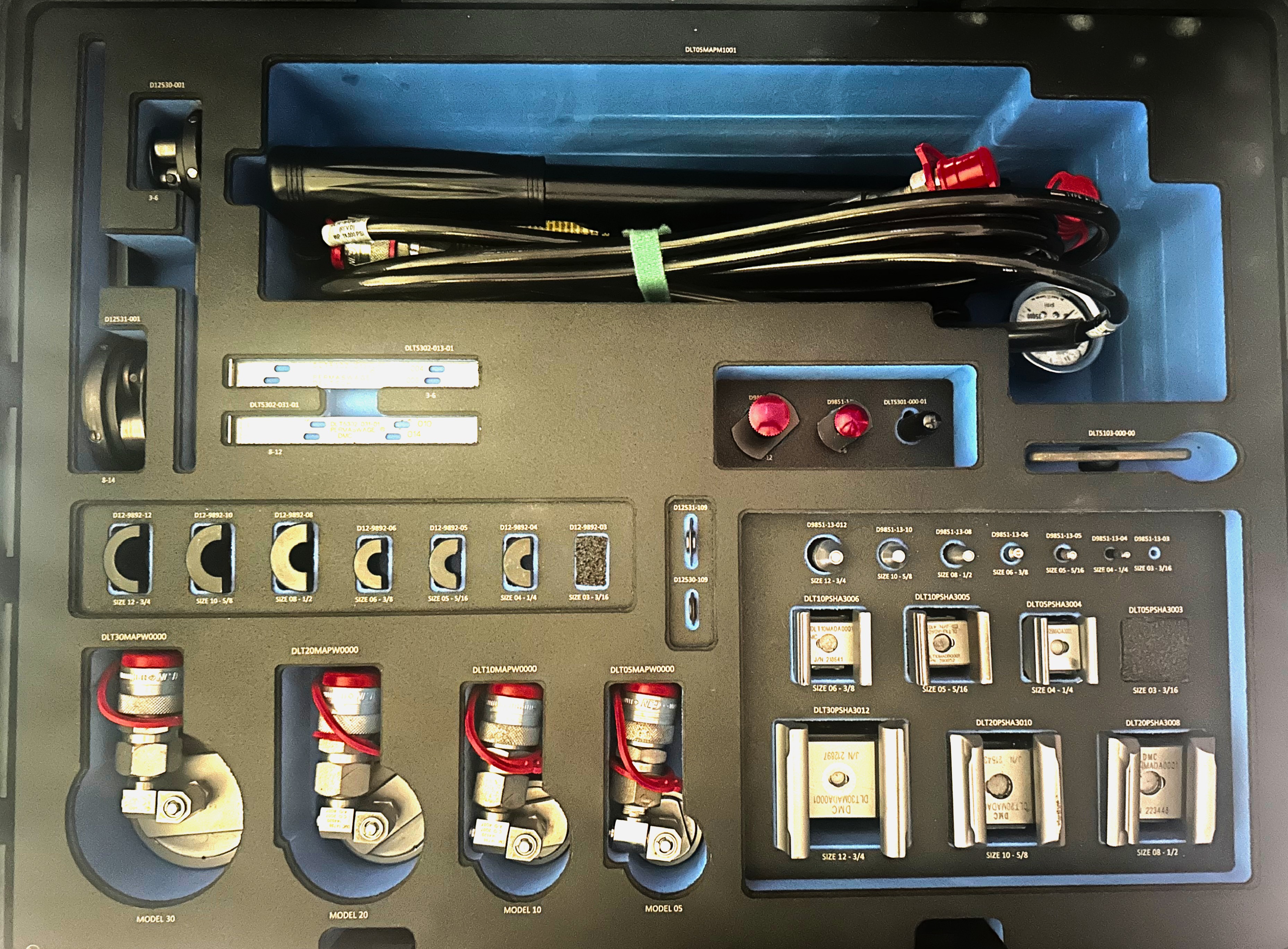The Permaswage® DLTFRPSKT3004 Field Repair Tool Kit is designed for tubing sizes 1/4" (size -04), 5/16" (size -05), 3/8" (size -06), 1/2" (size -08), 5/8" (size -10), and 3/4" (size -12). The tools in this kit operate at up to 10,000 psi and are suitable for hydraulic lines with operating pressures of up to 3,000 psi, ensuring durable, leak-resistant Permaswage connections. This kit includes all the tools and accessories to perform swaging operations for the listed sizes, including swage heads, deburring tools and stems, inspection gauges, tube cutters, and marking tools. It is compatible with manual pumps and designed for high-quality field repairs and installations across various environments.