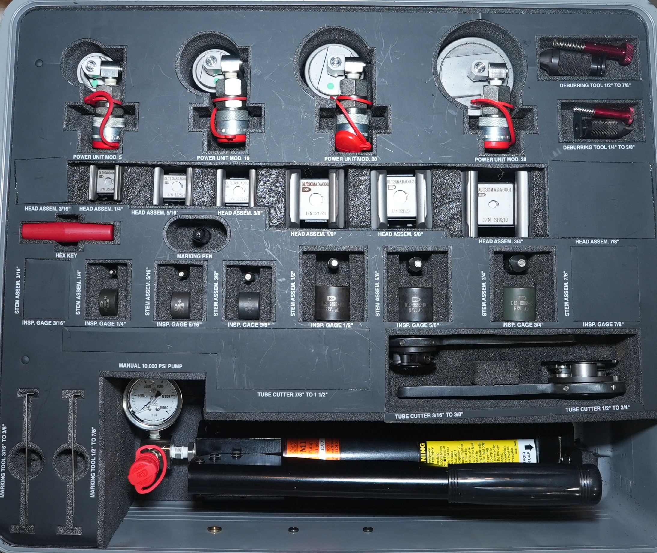The Permaswage® DLTFRPSKT3004 Field Repair Tool Kit is designed for tubing sizes 1/4" (size -04), 5/16" (size -05), 3/8" (size -06), 1/2" (size -08), 5/8" (size -10), and 3/4" (size -12). The tools in this kit operate at up to 10,000 psi and are suitable for hydraulic lines with operating pressures of up to 3,000 psi, ensuring durable, leak-resistant Permaswage connections. This kit includes all the tools and accessories to perform swaging operations for the listed sizes, including swage heads, deburring tools and stems, inspection gauges, tube cutters, and marking tools. It is compatible with manual pumps and designed for high-quality field repairs and installations across various environments.